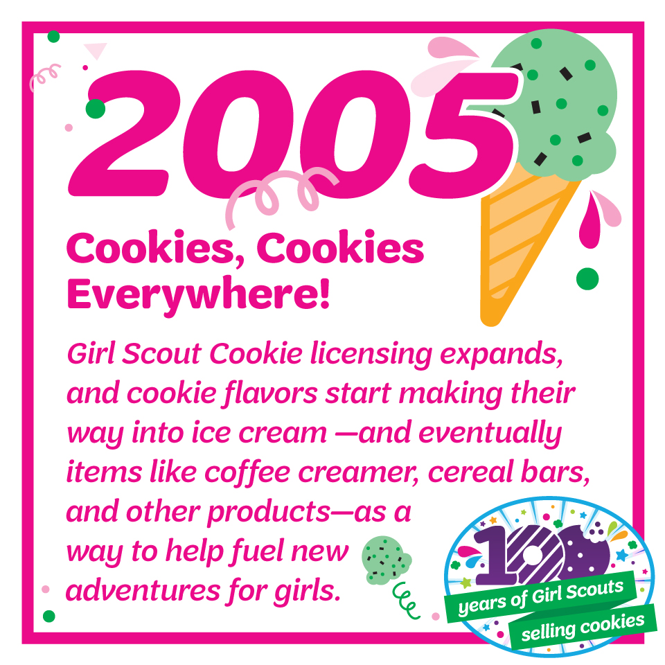 I illustrated a collection of custom icons and patterns based off of the 100 Years of Girl Scouts Selling Cookies logo, and used all the graphics to build a timeline of GS’s Cookie History for their social media.